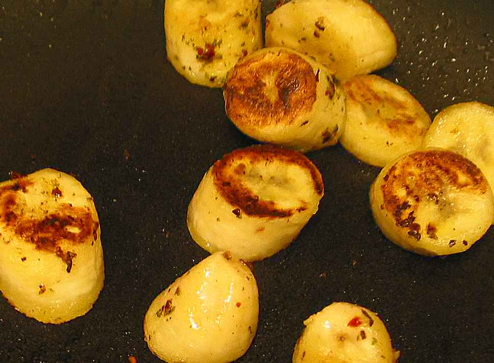 Peel the bananas–you may need a knife if they’re really green. Be careful peeling them, because the green peel contains a drippy sap that will stain clothes badly like some tough kind of glue, and I still haven’t found a way to get it out of my favorite pants. In any case, cut the bananas in bite-sized chunks or larger pieces, as you prefer. Heat a spoonful or so of olive oil with a little z’khug in a nonstick frying pan and then pan-fry the banana pieces a few minutes until the outsides turn brown and crispy, like good french fries. A dab of pesto or a little curry powder and minced garlic and ginger and/or scallion in the frying oil would probably also work in place of the z’khug.