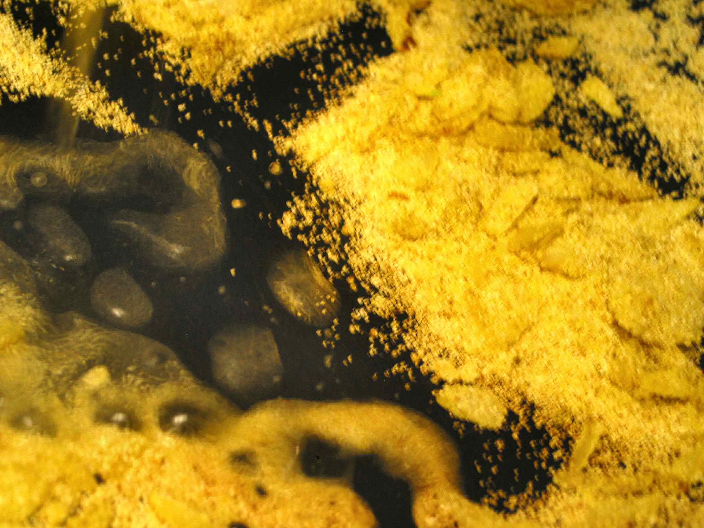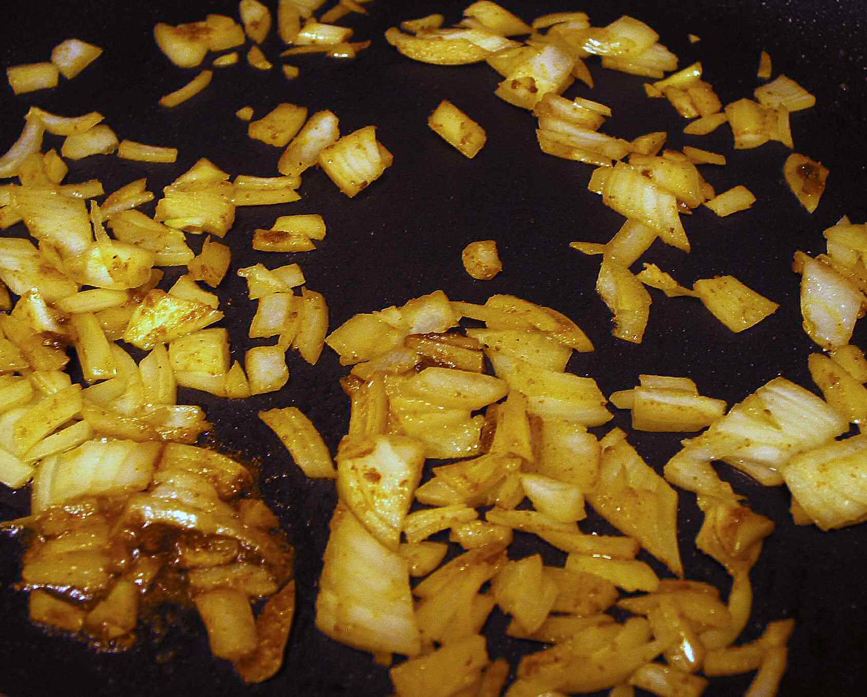 Have a cup or so of water at the ready. Stir-fry the onion in a spoonful or so of oil and add a spoonful of curry powder. Don’t let it burn–about 30 seconds in, dump in the dry farina and stir well so that everything colors yellow and the onions continue to cook and brown a little. You may need a little more olive oil. You want to stir-fry the farina just enough to start toasting a little and turn golden but not enough to brown badly or burn.
