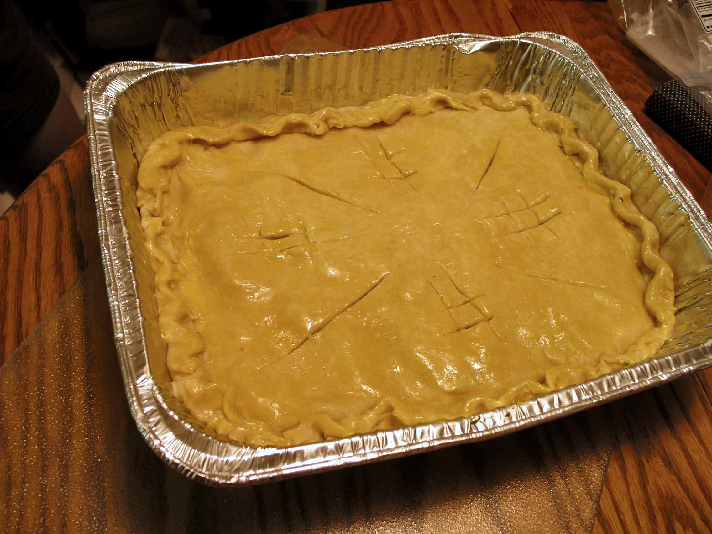 When you’re ready to roll out the dough, preheat the oven to 375 F. Divide the dough into halves, flour them and roll out between sheets of plastic wrap or parchment paper to fit a fairly large shallow casserole or pan (can be a lasagna pan, as we used), about 12 inches across and maybe 2 inches deep.