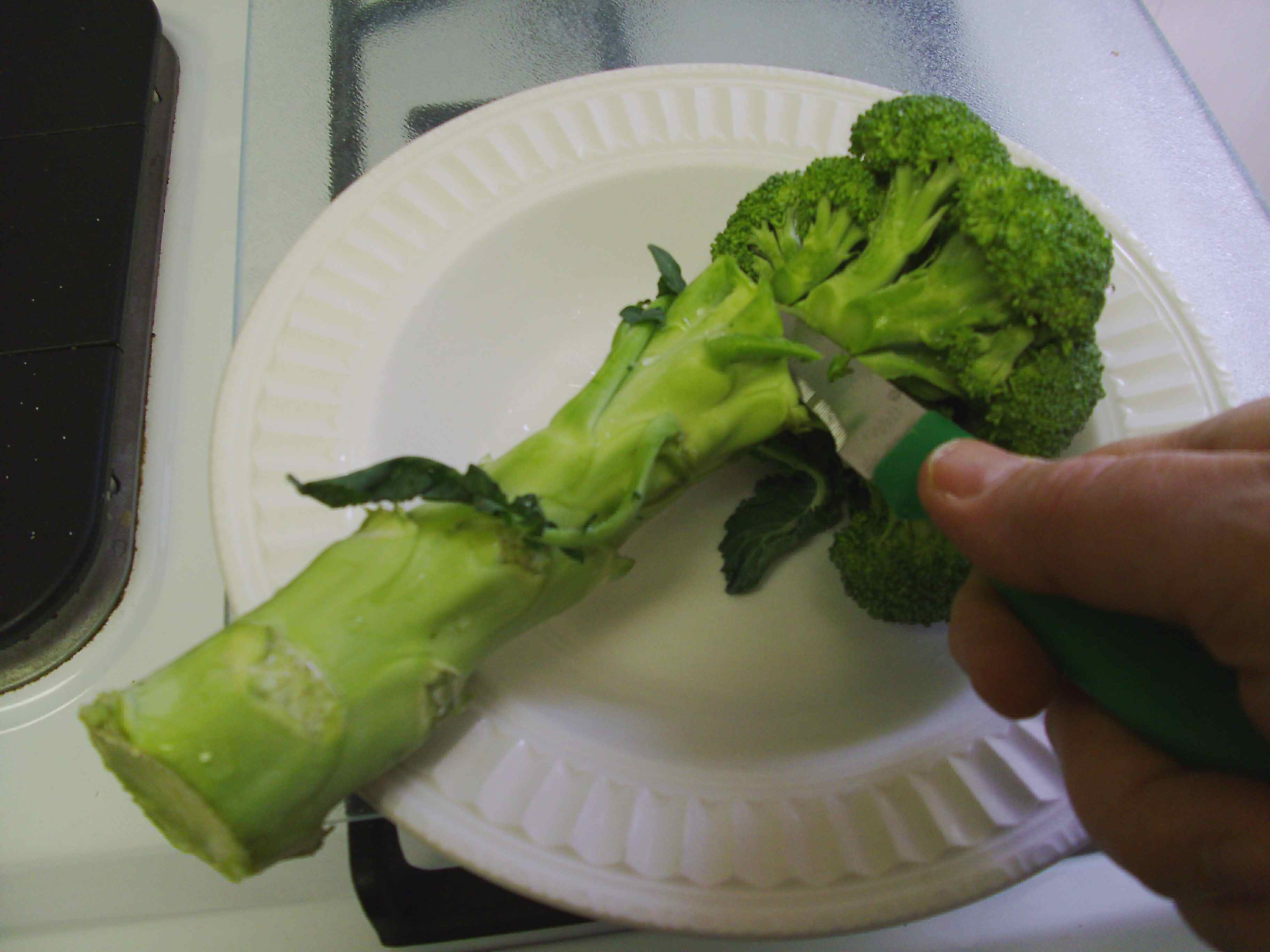 Step 1: Buy broccoli with the stalks left on. It’s always cheaper than the broccoli “crowns”, the stalk is good eatin’ if you know how to deal with it, and you get more useable green for your green. Those plastic bags of precut florets are right out. Sky-high-ripoff expensive and not fresh. Pick firm stalks with tightly packed dark green florets and no brown spots. Buy as many as you need for the dinners you plan to serve that week and have room for in the fridge. Figure a 6- to 8-inch stalk with florets 3-4 inches across will serve about 3 people pretty well.