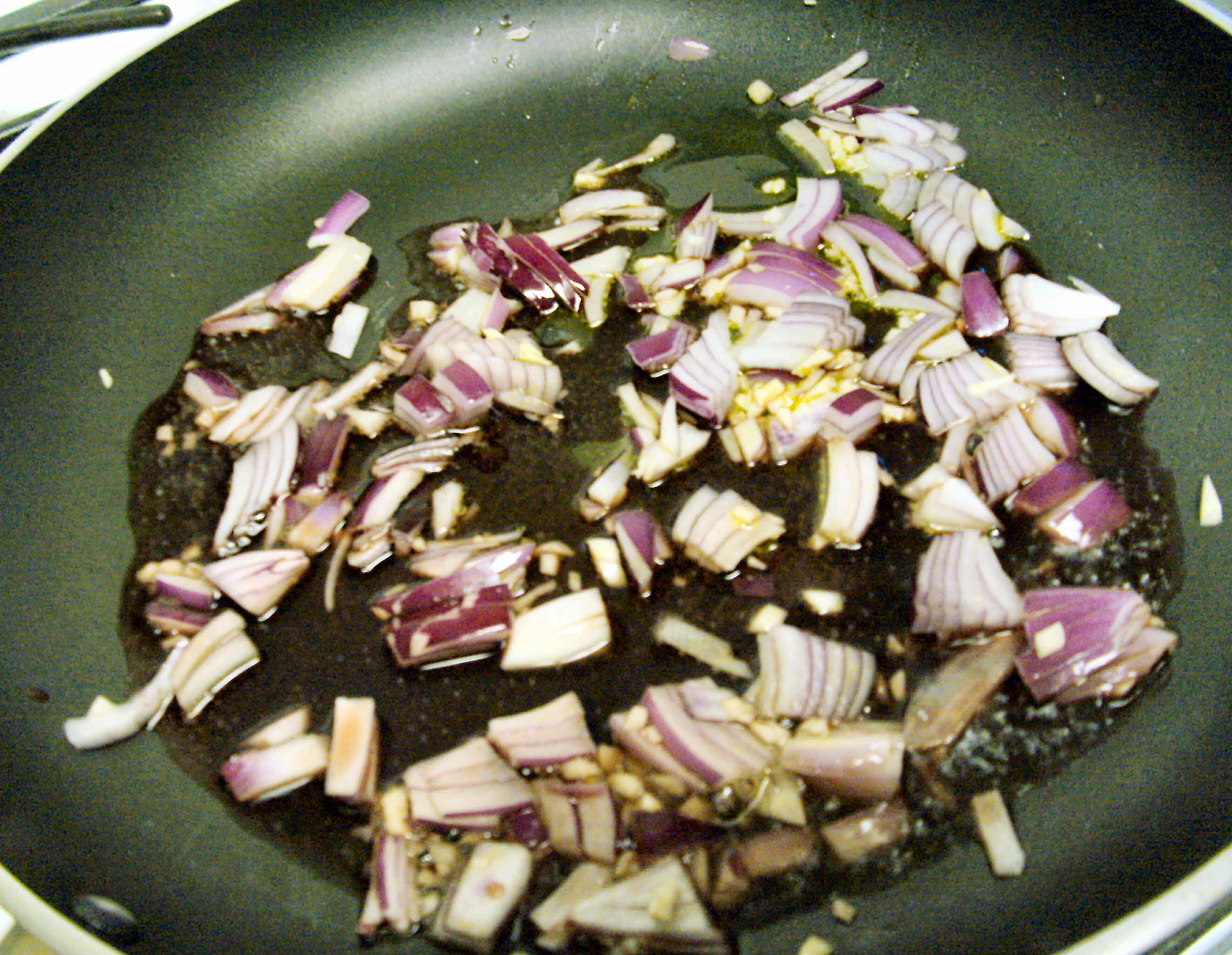 Heat garlic in olive oil a few seconds. You can add onions and a little red wine and cook down until the wine’s down to a spoonful and the onions are browning if you want.