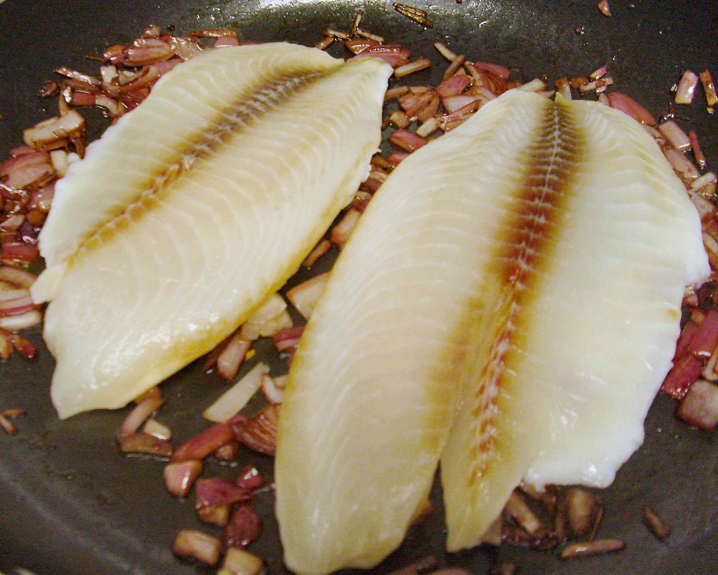 Tilapia fillets frying skin side up on top of the onions and garlic. The wine I added to the pan has cooked down to nearly a film before I added the fish.