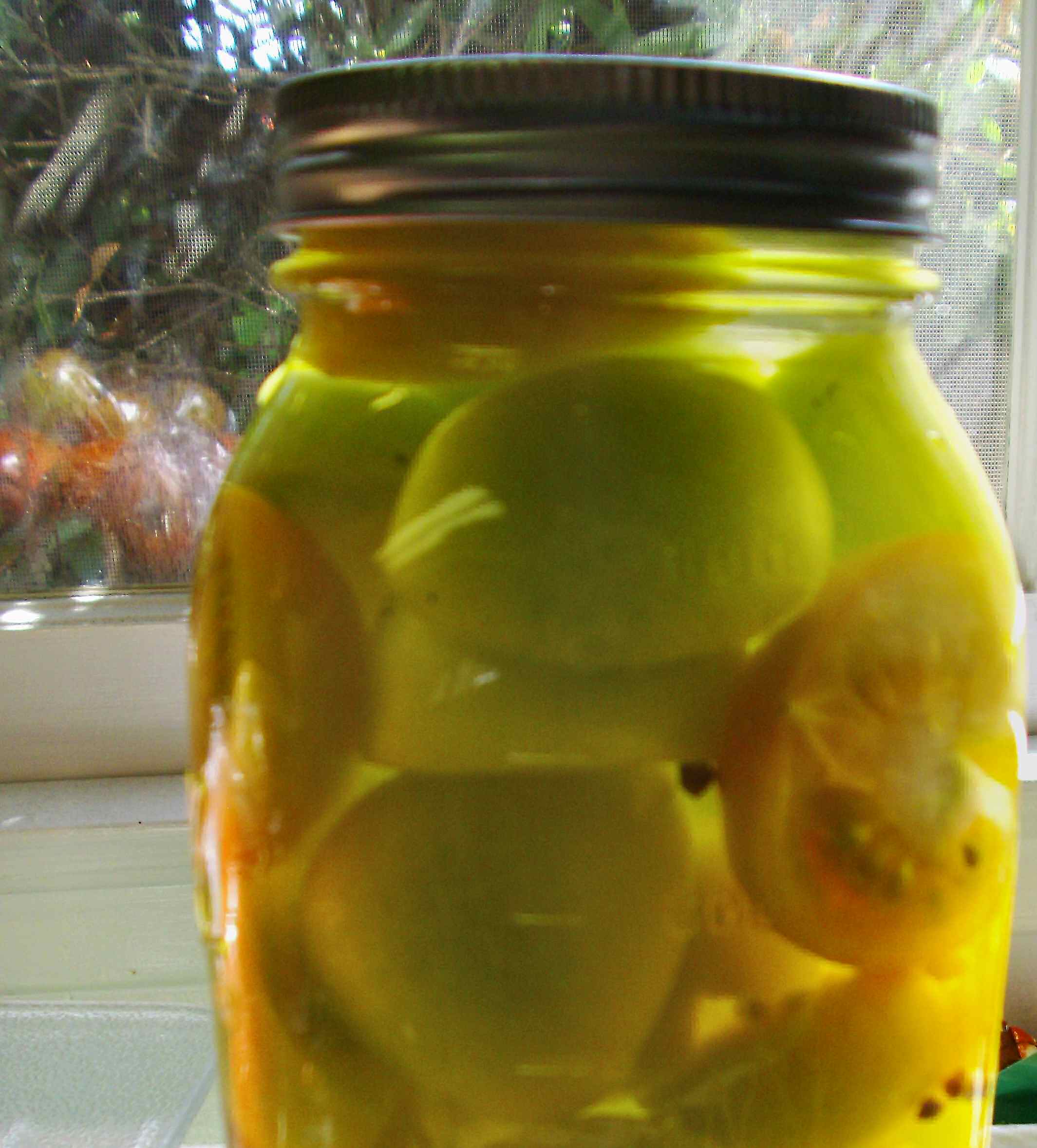 Cut each tomato in halves or quarters, depending on how big they are–you want pieces that are 1 inch thick or so, so for green Roma or medium round tomatoes you’d want quarters; for large cherry tomatoes just cut them in half. Place the tomatoes in the jar with the dill and spices, using a spoon to help push them into any empty spaces. Pour the cooled brine over them, tapping the jar gently on the counter every so often to bring up any hidden air bubbles, and fill to the rim. Put the lid and collar on tightly, turn the jar over and back a couple of times to make sure the brine gets everywhere (inside the jar, I mean–hopefully no major leaks!) and store the jar in a cool darkish spot on the kitchen counter for 2-3 days to ferment (some bubbles should form at the top). Then store in the fridge and use within a week or so–half-sour dill-style pickles, whether tomato or cucumber, don’t store on the shelf and they don’t last quite as long as the standard boiled-in-vinegar-and-tons-of-salt type. On the plus side, they’re fresher-tasting and crunchier, and more about the dill and garlic.