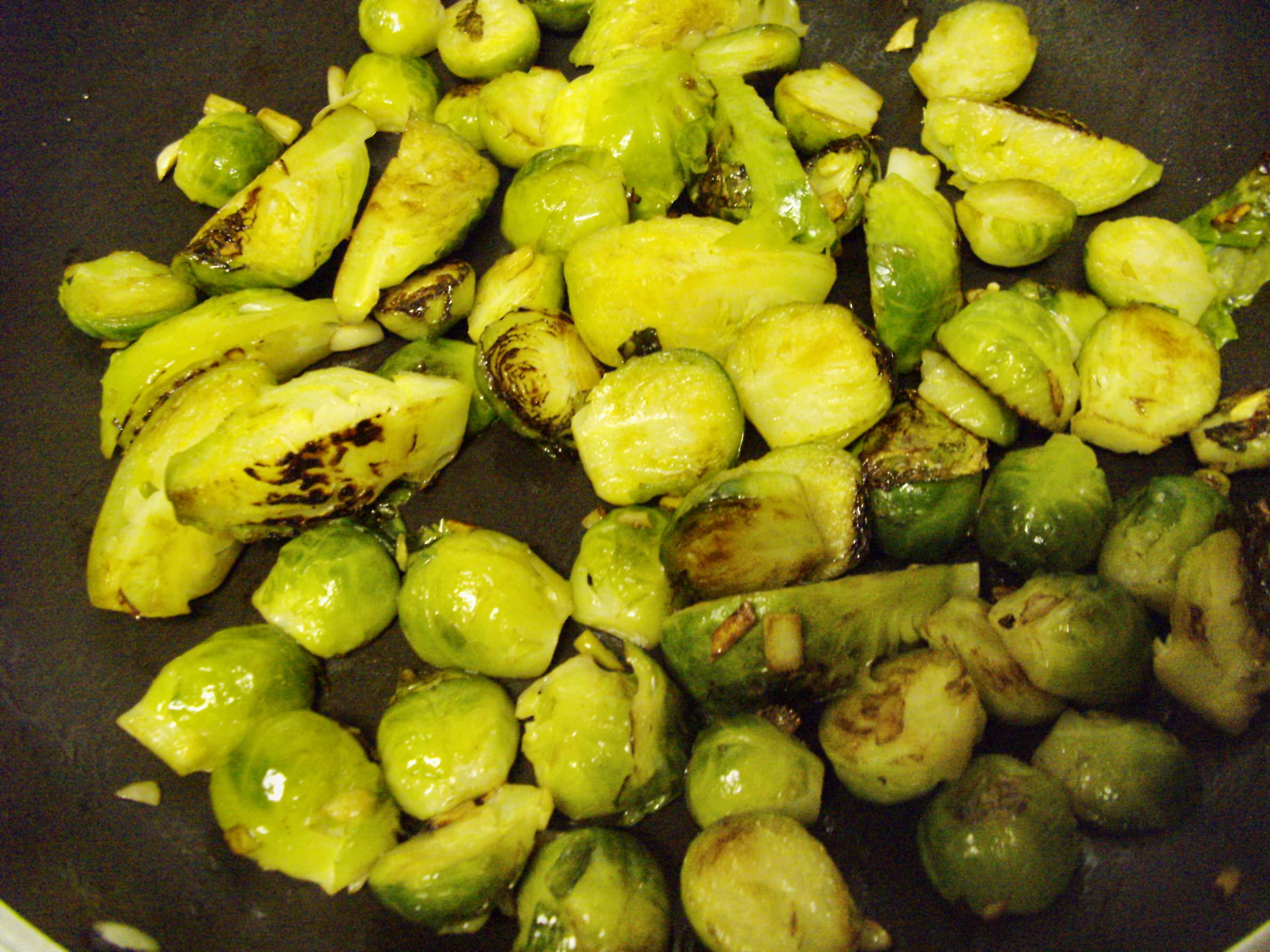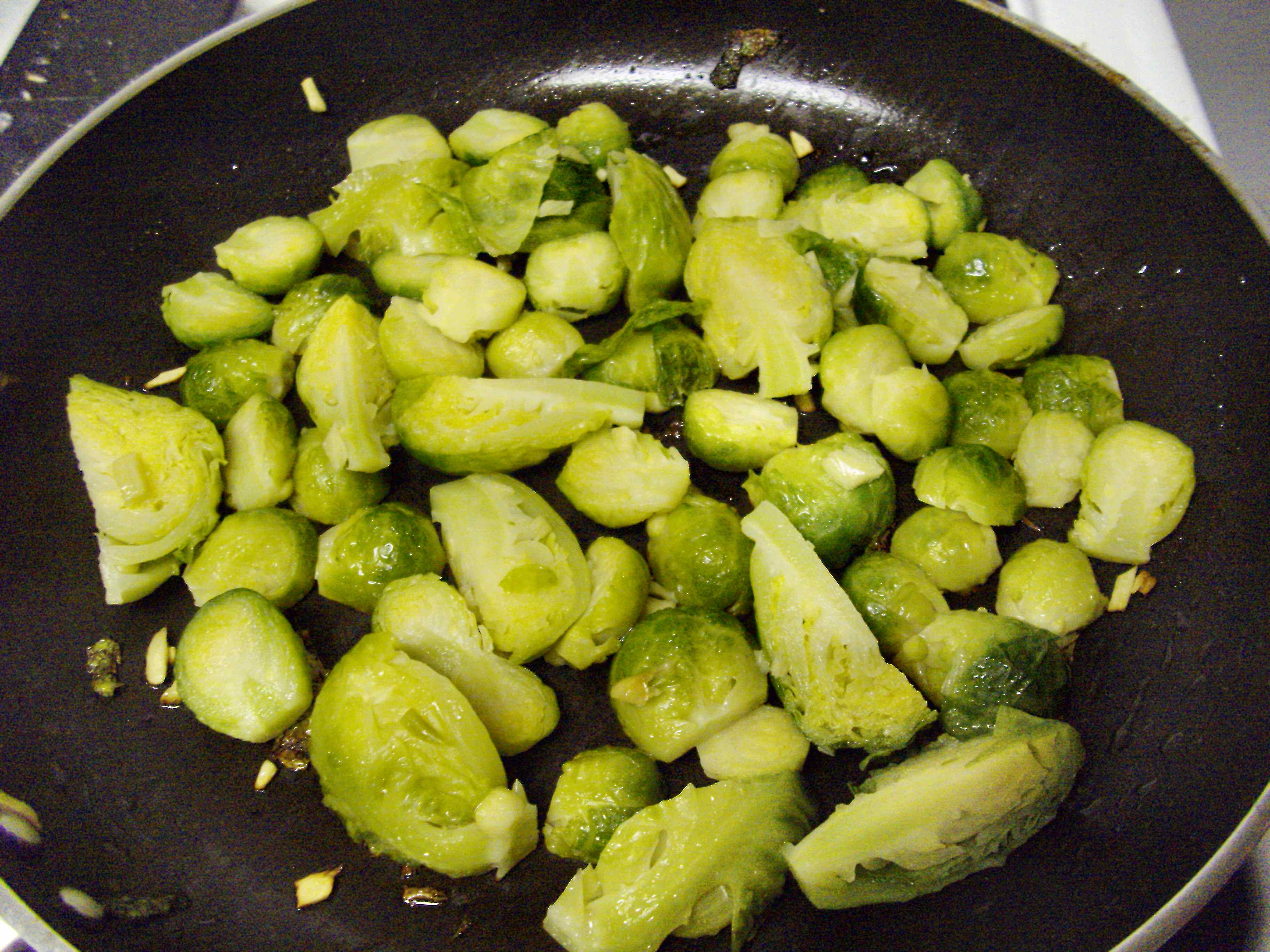 Trimmed and steamed and fresh brussels sprouts. Your choice of pan-steaming or microwaving with a bit of water and a lid for a couple of minutes before starting to brown them.