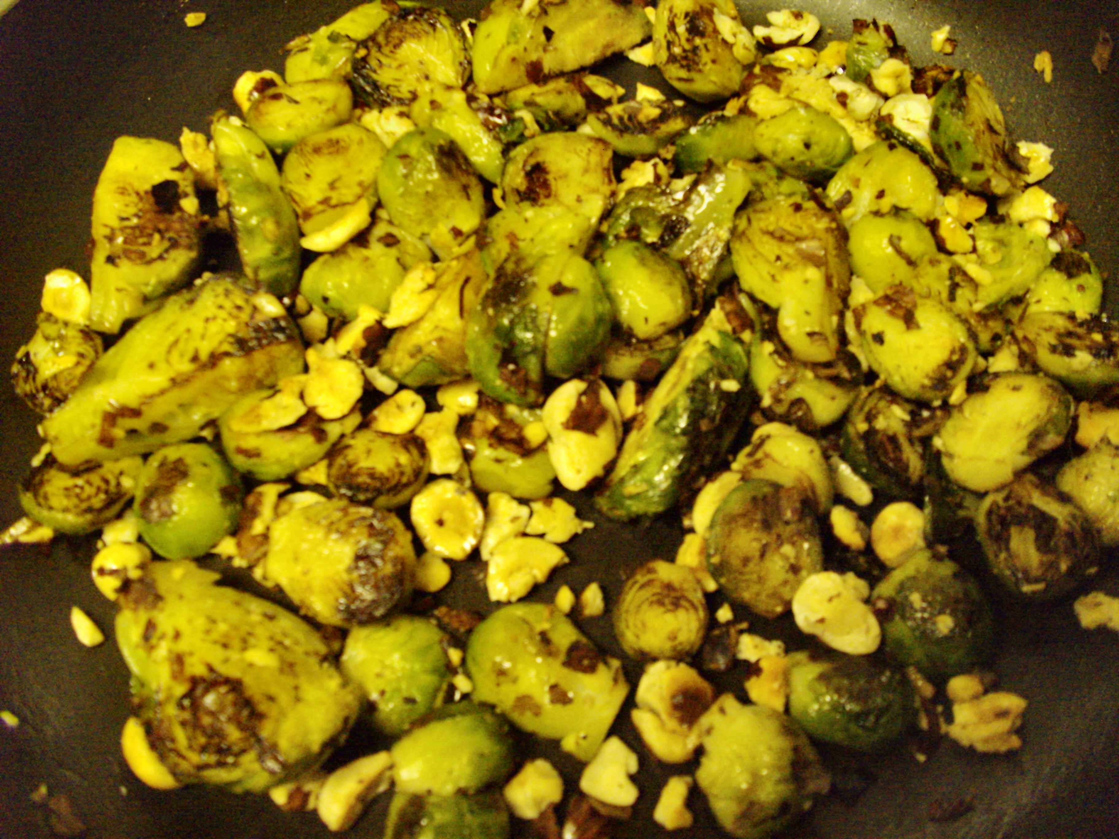 So if you make this kind of dish, get out a large nonstick frying pan and a little olive oil and split the pre-steamed sprouts into batches as needed, and brown them with the nuts and garlic a few minutes until they color and the fragrance comes up. It’s worth it and you might not need to stick them in the oven as long or possibly at all. And obviously, if you don’t have a prejudice against microwaves I say go for it and do the preliminary steaming that way.