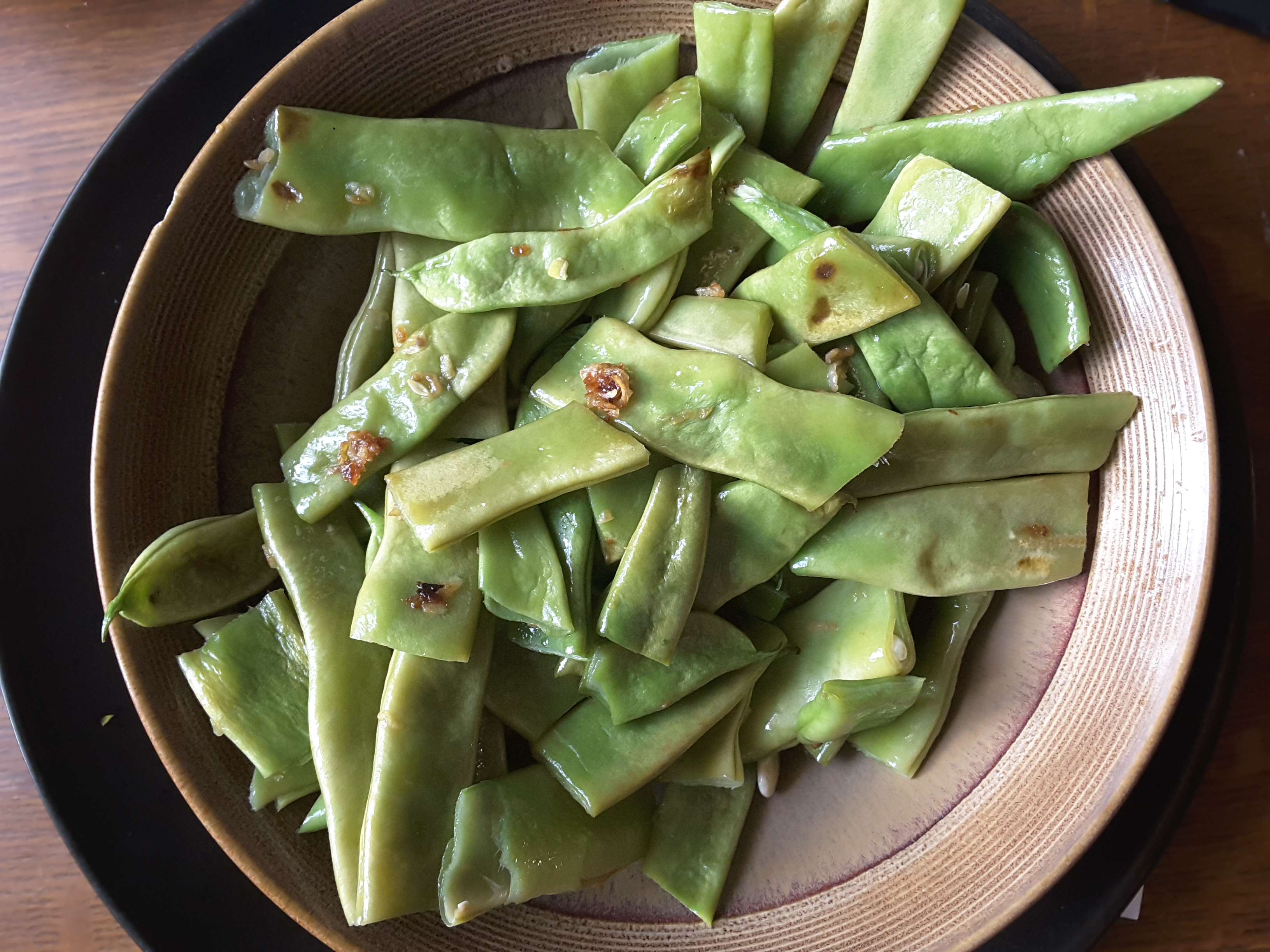 Sometimes this kind of foraging has given me a chance to try out some of the more expensive produce I’d usually pass over or else worry about how to use “correctly” because of the price. A few weeks ago I bought romano beans, usually $3 per pound, at an extreme bargain–a three-pound bag for a dollar, or about 33 cents a pound. A few of the beans were starting to develop light rust marks along the edges, easily trimmed, but only one or two had any signs of spoilage at all, and they kept well in the fridge for over a week.