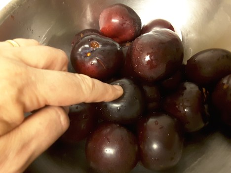 One of the bargain bags was more of a challenge, because it held about 3 pounds of very, very ripe to squishy black plums–exactly how squishy I wasn’t sure, because a few of the plums were still firm, but overall, pretty squishy. I hesitated; it was pretty far past most people’s limits of tolerance. But because it’s me I still thought, what the heck, I’ll rinse them off and then decide. I can compost them if they’re too awful to use.
