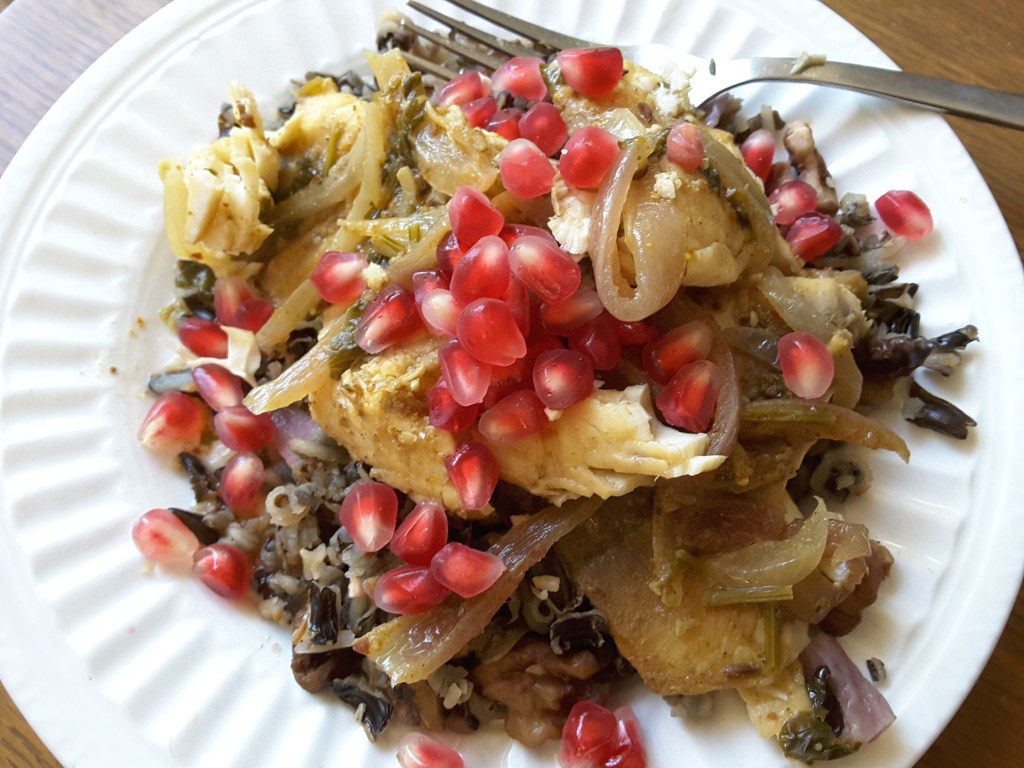 When I was younger and well before I had a child (who is now old enough to cook with her housemates, and did), I would make this pilaf in an electric wok with a lid, frying the onions and mushrooms first with the herbs, then adding the wild rice and some pearl barley and broth, bringing it to a boil and turning it down to simmer with a lid for however long, checking once in a while and stirring in the fruits and nuts and adding a little broth or water as needed. Similar idea to the microwaving, but on a stove or any heat element, you need to stay a lot more present. Microwaving lets you go away–it can stop itself and sit for a while without things drying out and scorching.