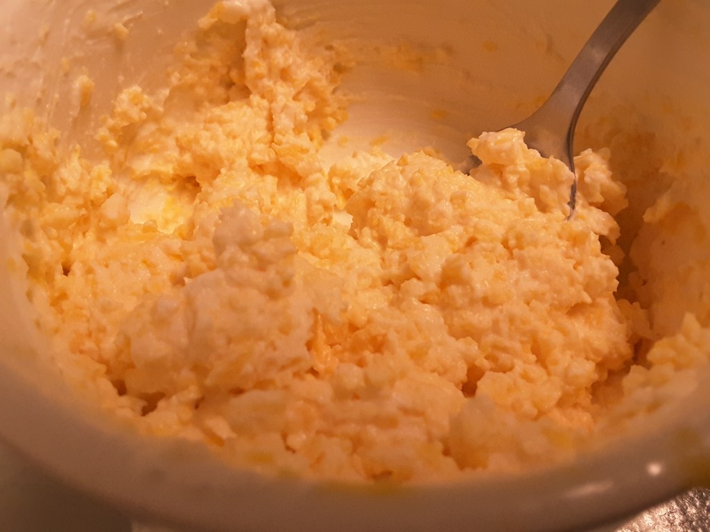 The only problem is that when you grate cheddar and mix it into Greek yogurt, you get shreds-in-yogurt, not a smooth blend. Sort of like pimiento cheese, but less greasy. So–microwave to the rescue, again. And again, very, very sparingly. You want to just barely soften the cheese shreds without heating them and you don’t want to heat up the yogurt or it’ll break.