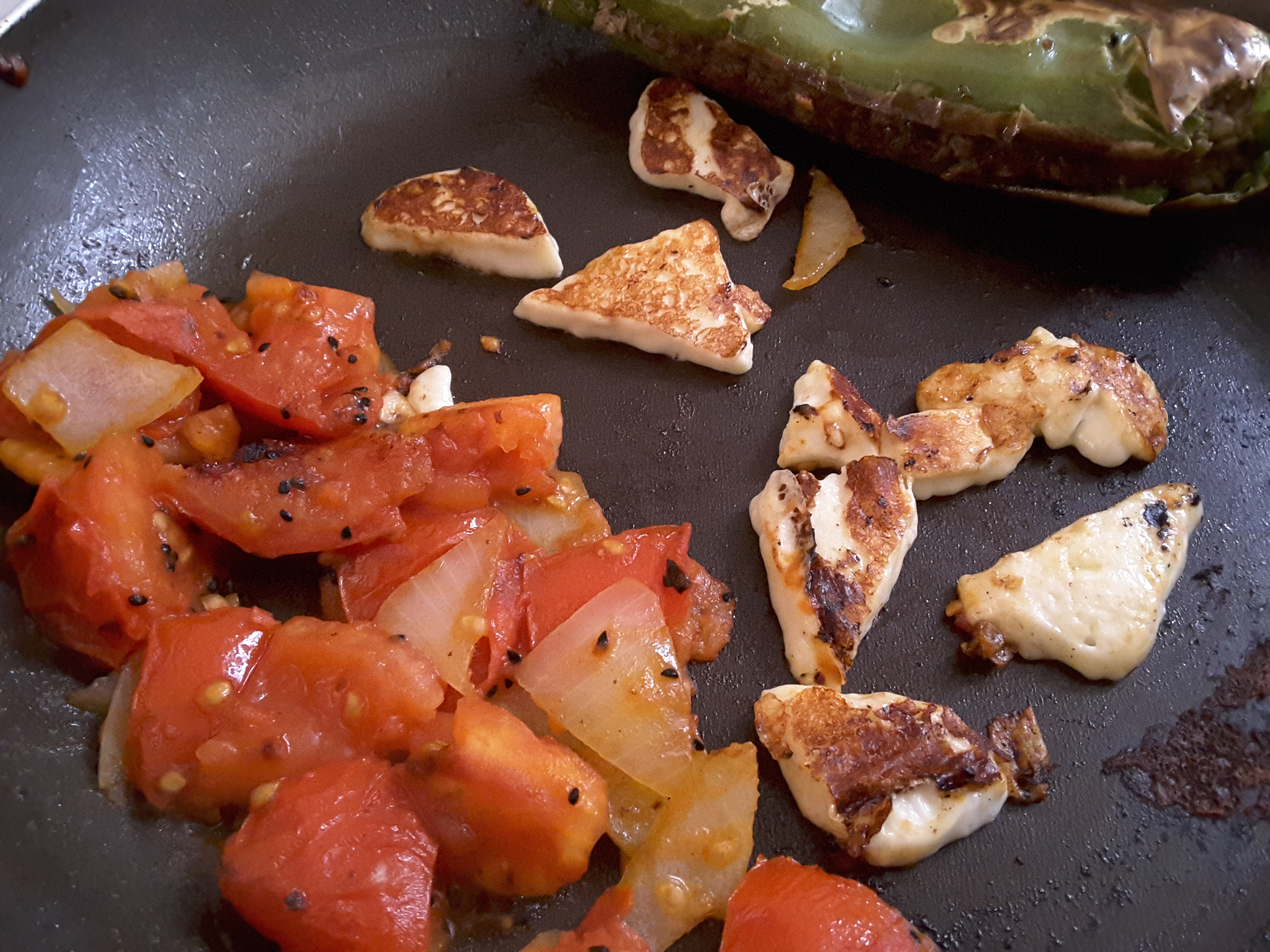Halloumi is the standard for grilled saganaki-style cheese because it holds its shape well. But it’s not available everywhere and it can be expensive. You can do well in the southwest US using queso fresco, panela or even paneer (storebought is fine for this, obviously–you’re trying to be quick) in cubes, triangles, rectangles, whatever, about 1/2 inch (1 cm-ish) thick. Move the pan-browned tomatoes to one side of the pan, drizzle in a bit more olive oil and brown the cheese. You can press the cheese in sesame or nigella seeds or za’atar mix or thyme or oregano before browning–all pretty delicious.