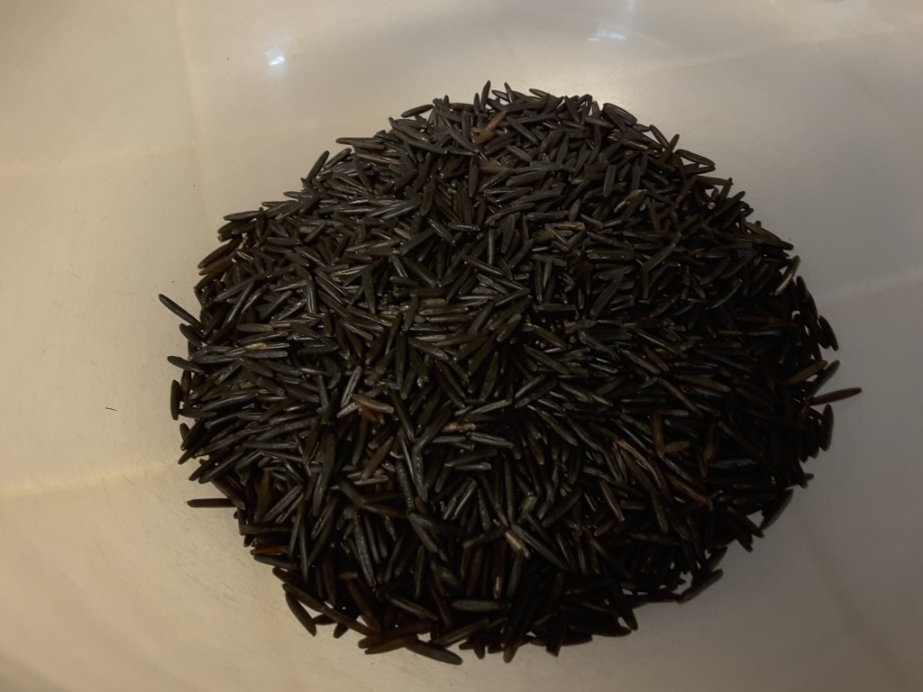 Microwaving works for brown rice, another long-cook whole grain, so it should (and in fact did) work for wild rice too. But it’s not quite the brief one-step kind of technique it is for white basmati rice. More a “nuke a few minutes to a simmer, let it sit 10 or so minutes to absorb hot liquid, stir, nuke a few more minutes and go away again, stir and check…..” kind of thing, similar to the way I cook beans, chickpeas and lentils, but with fewer rounds of cooking. I don’t know, it didn’t seem like a nuisance to me because I was doing two or three other things while it sat (one of those was sipping champagne while noshing with my husband on a few decorator cheeses and nuts and chatting with my in-laws and my daughter over Zoom). So I wasn’t in an overwhelming rush.