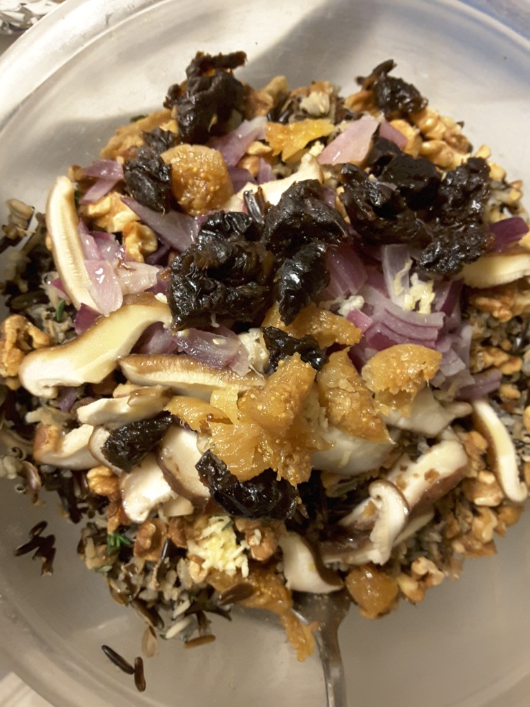When I was younger and well before I had a child (who is now old enough to cook with her housemates, and did), I would make this pilaf in an electric wok with a lid, frying the onions and mushrooms first with the herbs, then adding the wild rice and some pearl barley and broth, bringing it to a boil and turning it down to simmer with a lid for however long, checking once in a while and stirring in the fruits and nuts and adding a little broth or water as needed. Similar idea to the microwaving, but on a stove or any heat element, you need to stay a lot more present. Microwaving lets you go away–it can stop itself and sit for a while without things drying out and scorching.