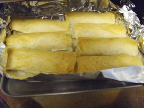 Baklava rolls browning in the toaster oven–don’t forget to set the temperature a little lower than for toasting so the tops don’t burn