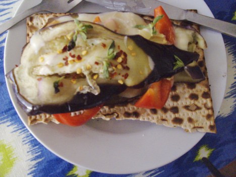 My standard eggplant microwave “melt” combo, with peppers and/or artichoke hearts and mozzarella/feta sandwiched between two slices of microwave-steamed eggplant. Salsa or shakshouka or even plain tomato sauce if you’ve got it, but jazz it up with hot pepper flakes and/or smoked paprika, or if you don’t have sauce then at least some hot pepper flakes, paprika, and basil or oregano–something.