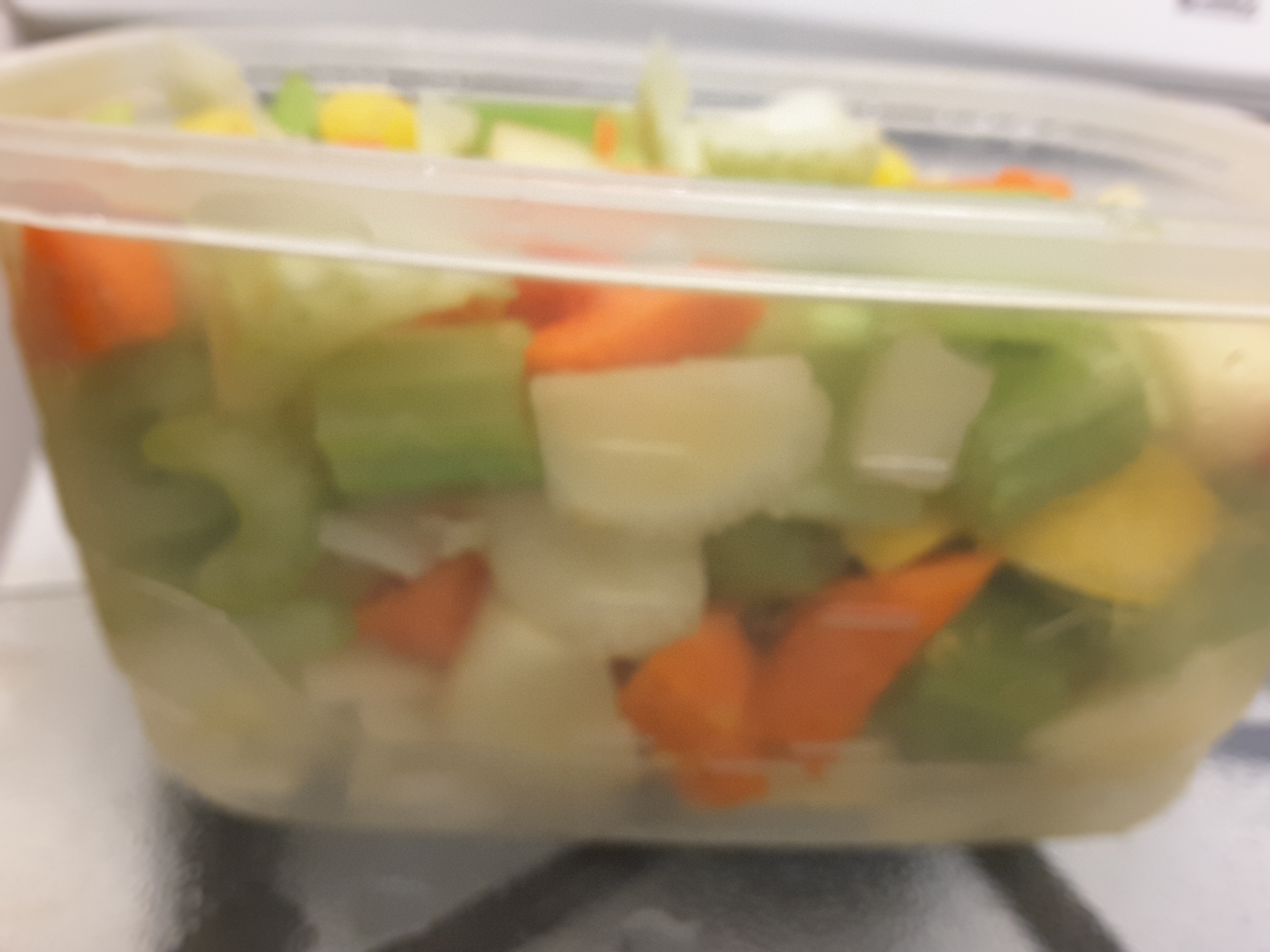 Fill up a 2.5 quart microwaveable bowl or container nearly to the top with chopped (bite-size pieces) vegetables. Stir in a spoonful of olive oil, and microwave-wilt the veg for 5 minutes on HIGH with the lid on. Add a fat minced or grated clove of garlic, a handful of dill and a few black peppercorns, plus water to cover and reheat another 5-6 minutes or until steaming hot, then let it sit with the lid on. Your soup will be pretty flavorful after letting it steep half an hour, if possibly a bit sweet (just one of those leftover mongo onions from last week’s “gifting” weighed a full pound on average). A squeeze of lemon and a dash of salt–not Campbell’s or Lipton’s level salting, salt-shaker-at-the-diner’s-discretion salting–and a grinding of pepper will work it out.