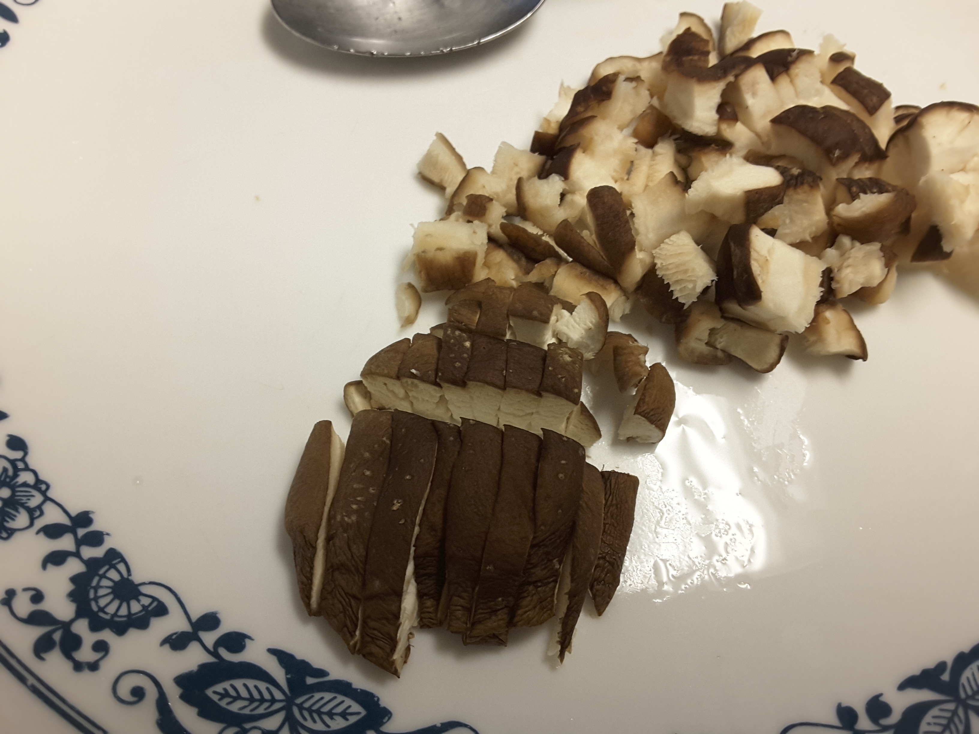 My current version (since I was gifted with celery as well last week) includes a couple of chopped stalks of celery with again, a very large onion. I also added in a bit of dill plus–chop ’em if you’ve got ’em–one or two finely-diced shiitake mushrooms, fresh or dried and soaked in half a cup of hot water,  for added not-chicken potency.