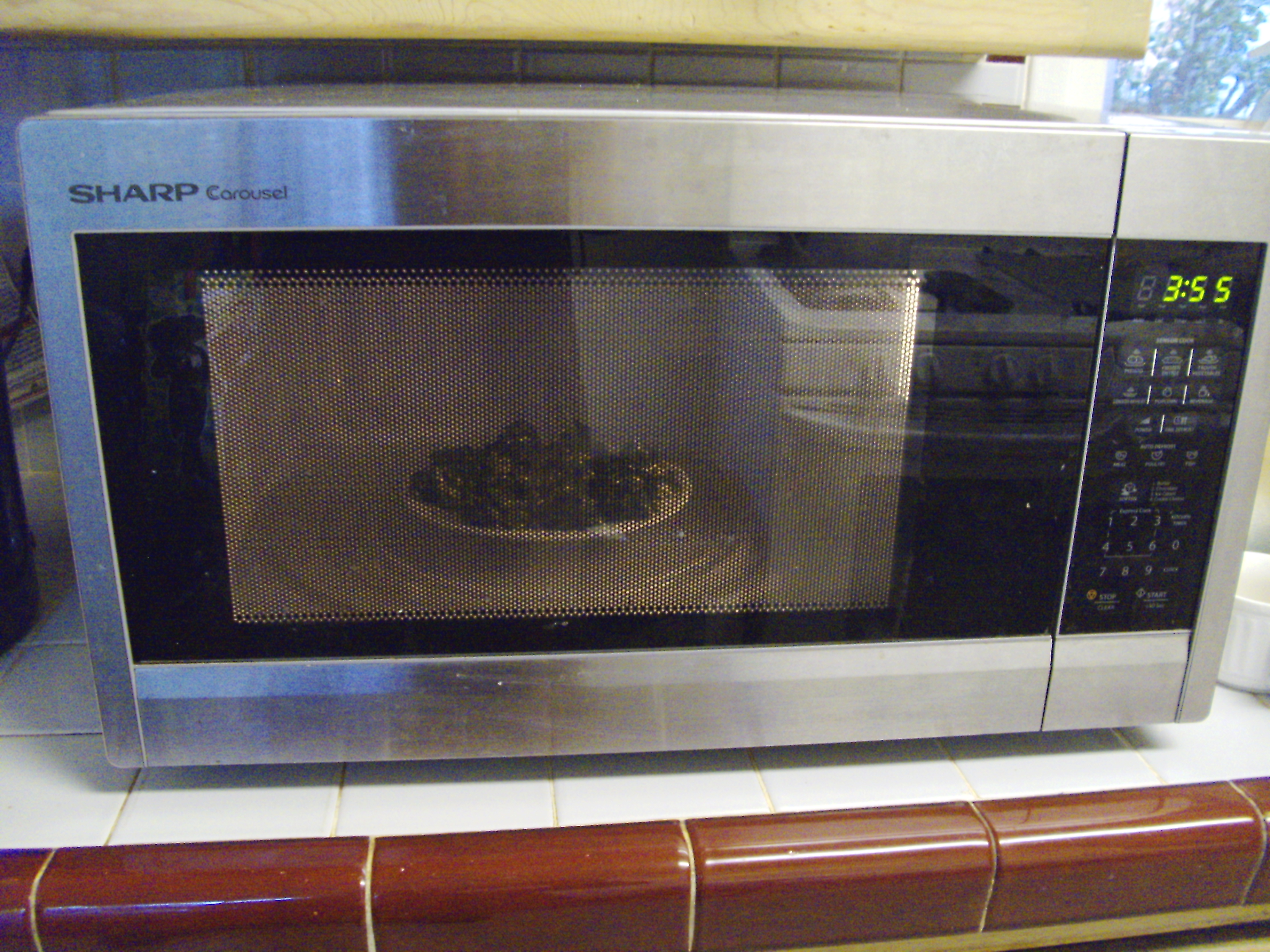 Any grain with a tough husk takes a longish time to cook conventionally on a stovetop compared with something like white rice or rolled oats. And wild rice is tough enough that the Trader Joe’s package directions strongly recommend soaking the stuff in a bowl of water in the fridge overnight before attempting to boil it. A good suggestion that would help for microwaving too–a fine suggestion, if only we had started with things the day before. Not all that helpful when you need it the same day.